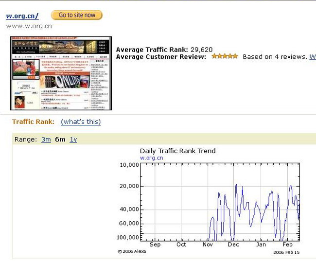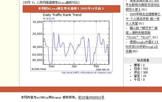 2006年2月21日北京时间8时45分,本人“家庭博客网(http://w.org.cn)”上的“Alexa排位变化曲线”(Daily Traffic Rank Trend)显示了2天前即2月19日Alexa曲线图(图一),但是点击进去,却看到了标示为2月15日的时间(图二)。